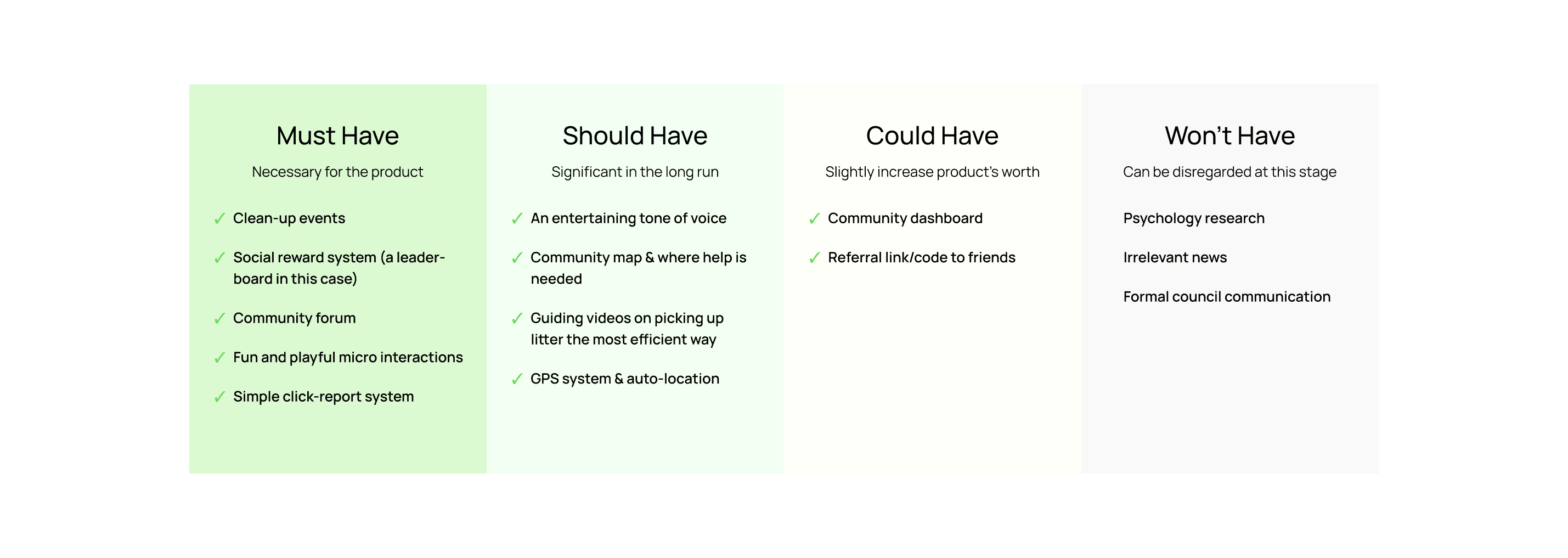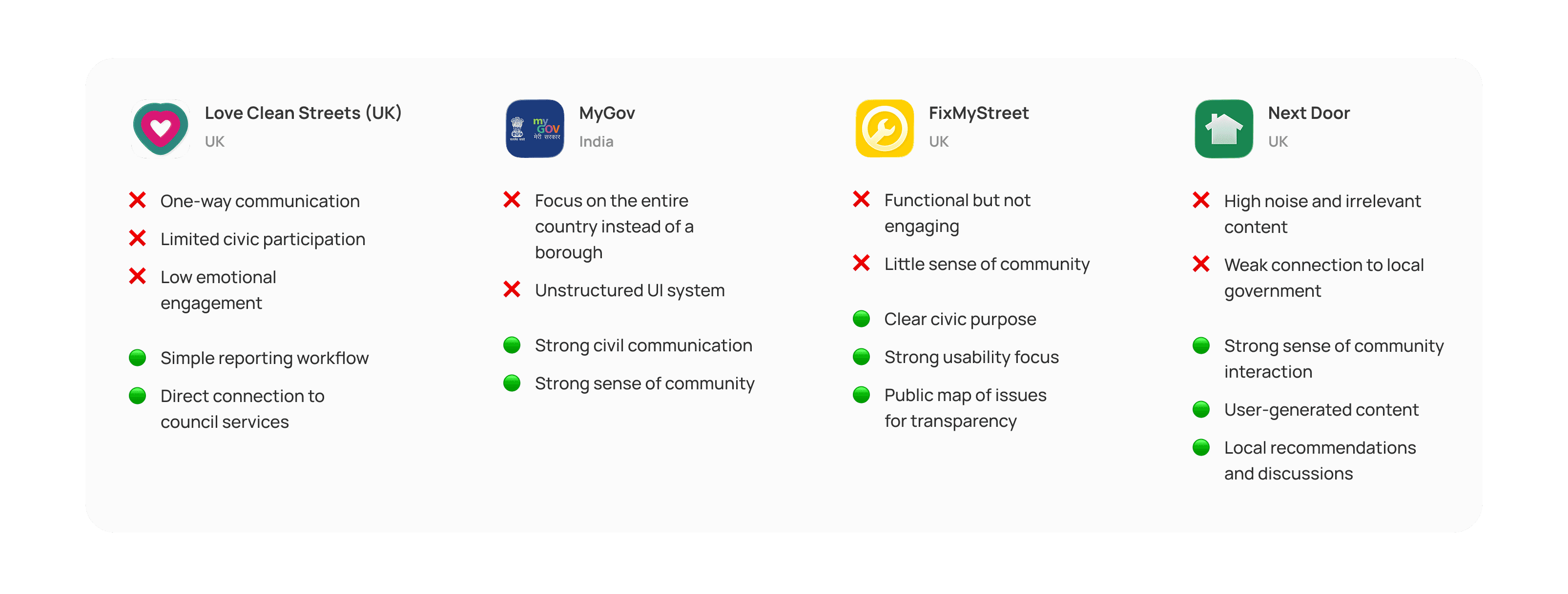I started off by monitoring direct and indirect competitors that provide similar concepts to my product: social integration, community news and litter report & cleaning. By doing so, I was able to hack into the definitive factors of what makes a successful civil app.