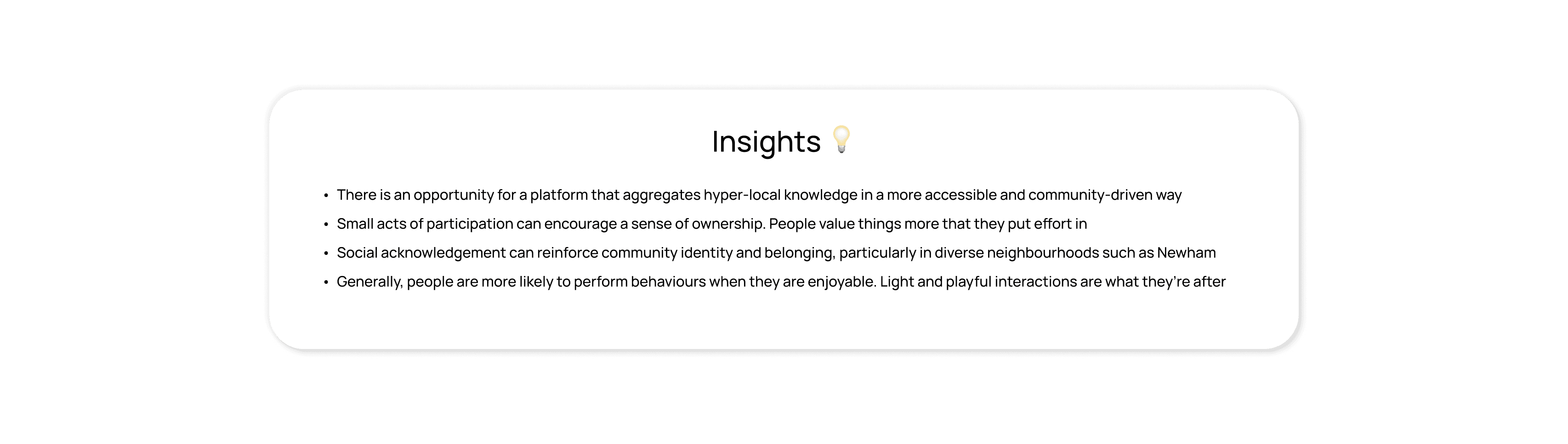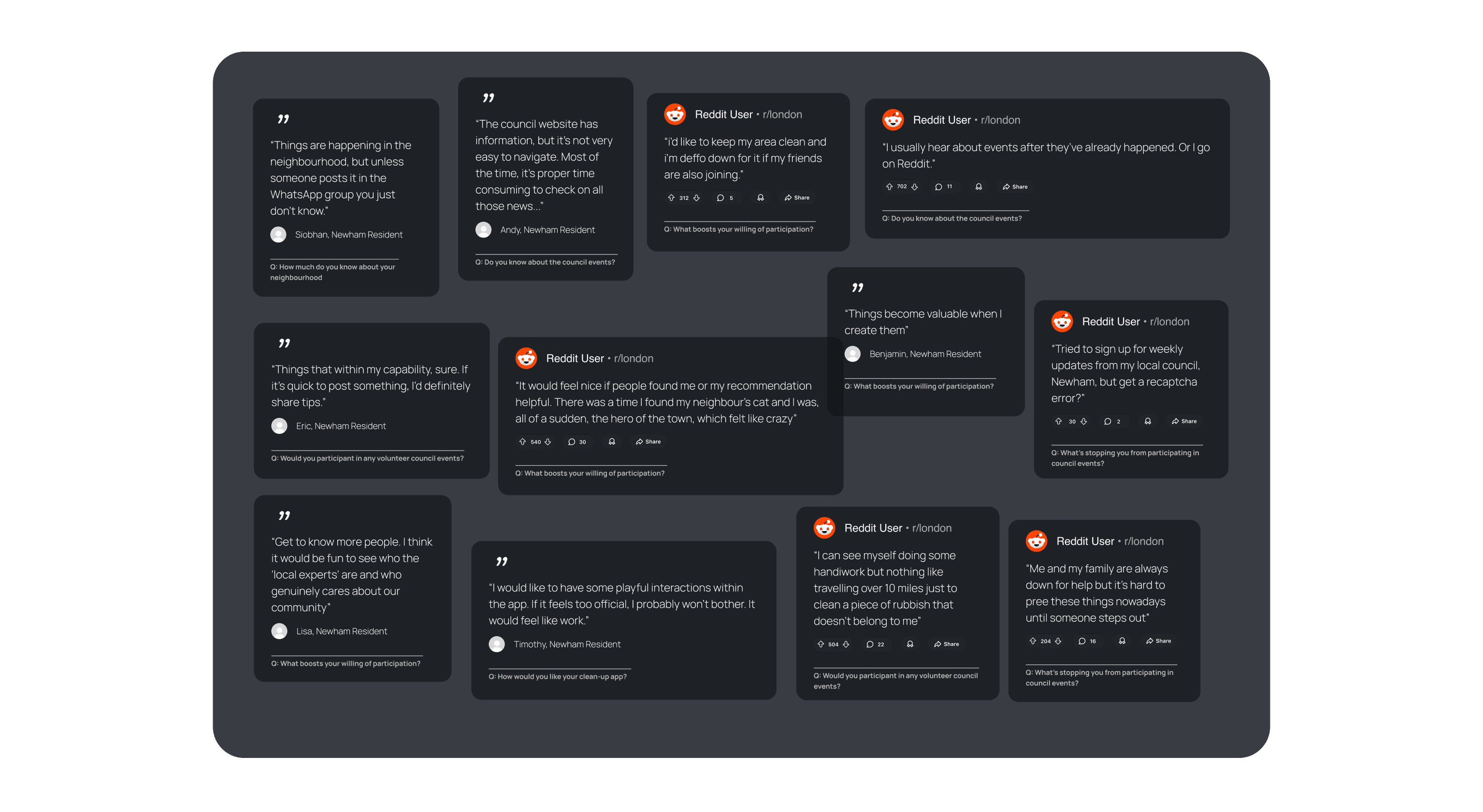 It's important to know what everybody thinks. Thus, we conducted a series of informal interviews with residents, shop owners and online community members in Newham to understand how people currently engage with their neighbourhood and what motivates them to contribute to local initiatives.
